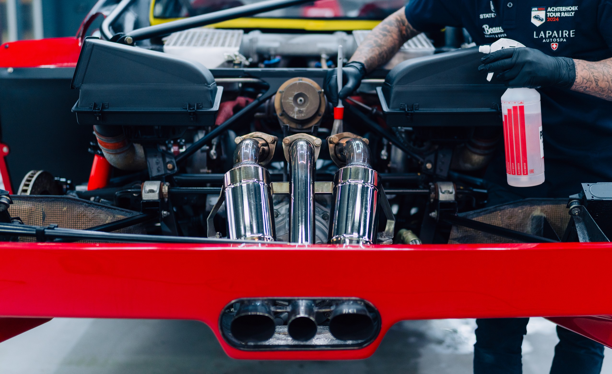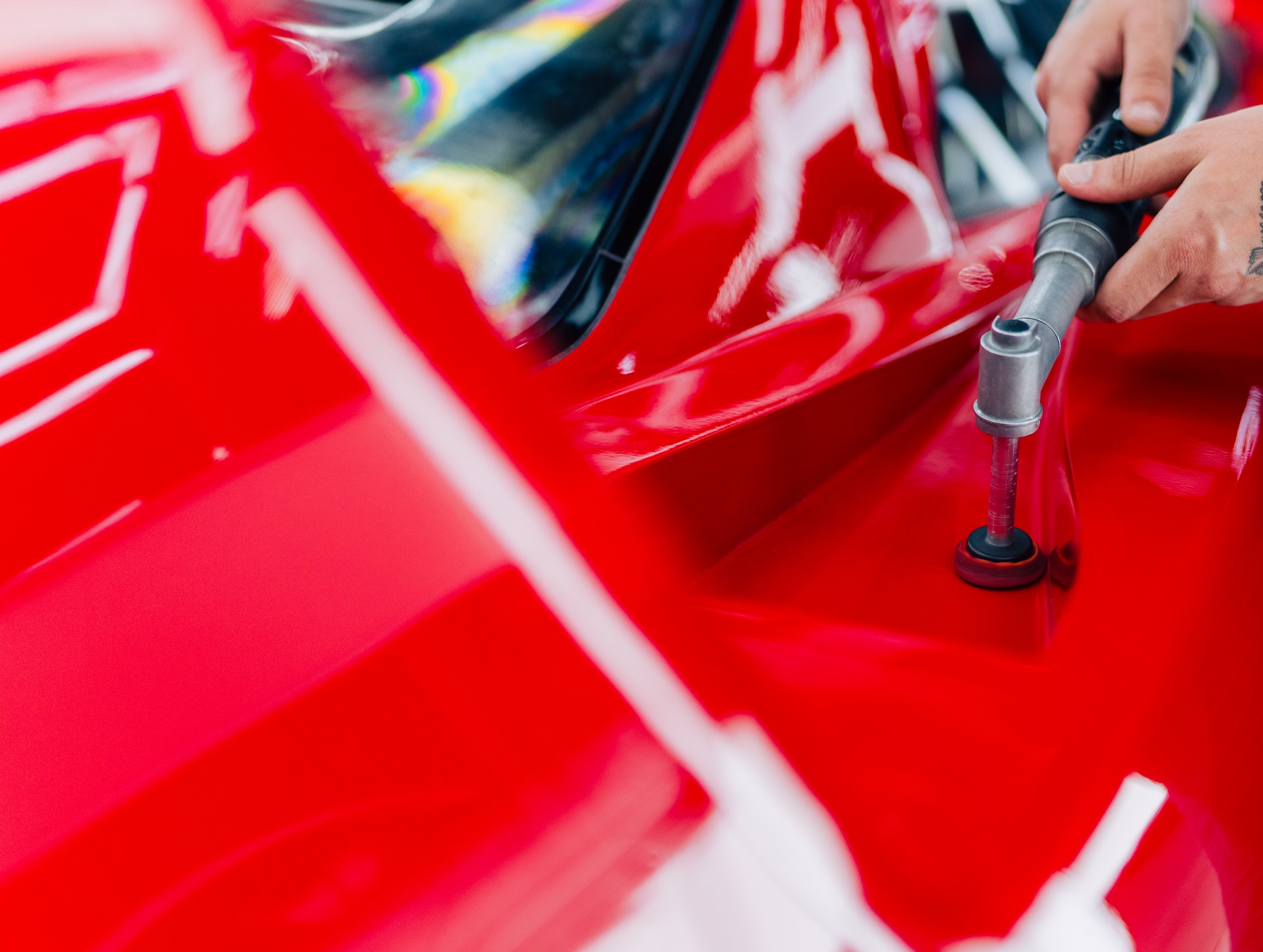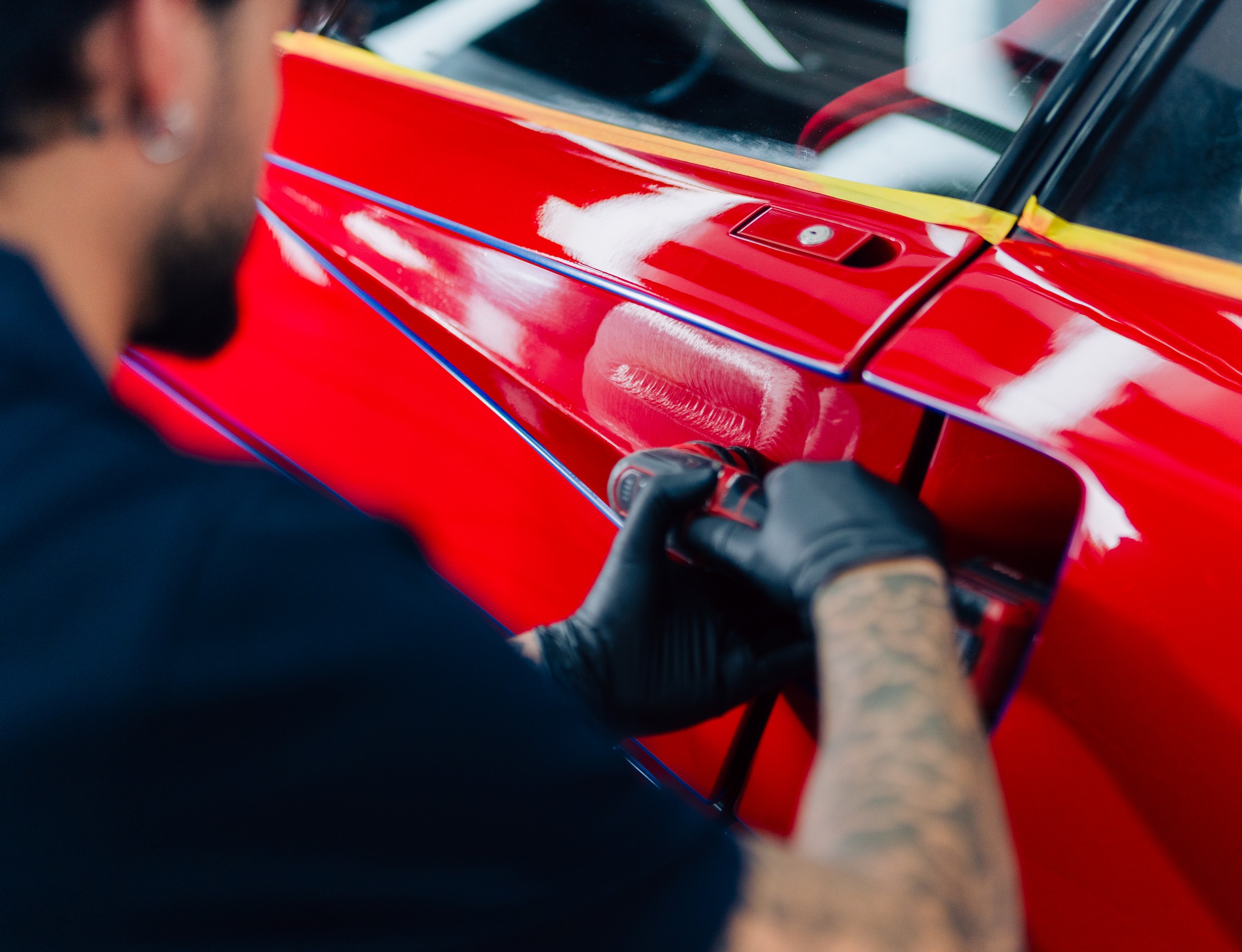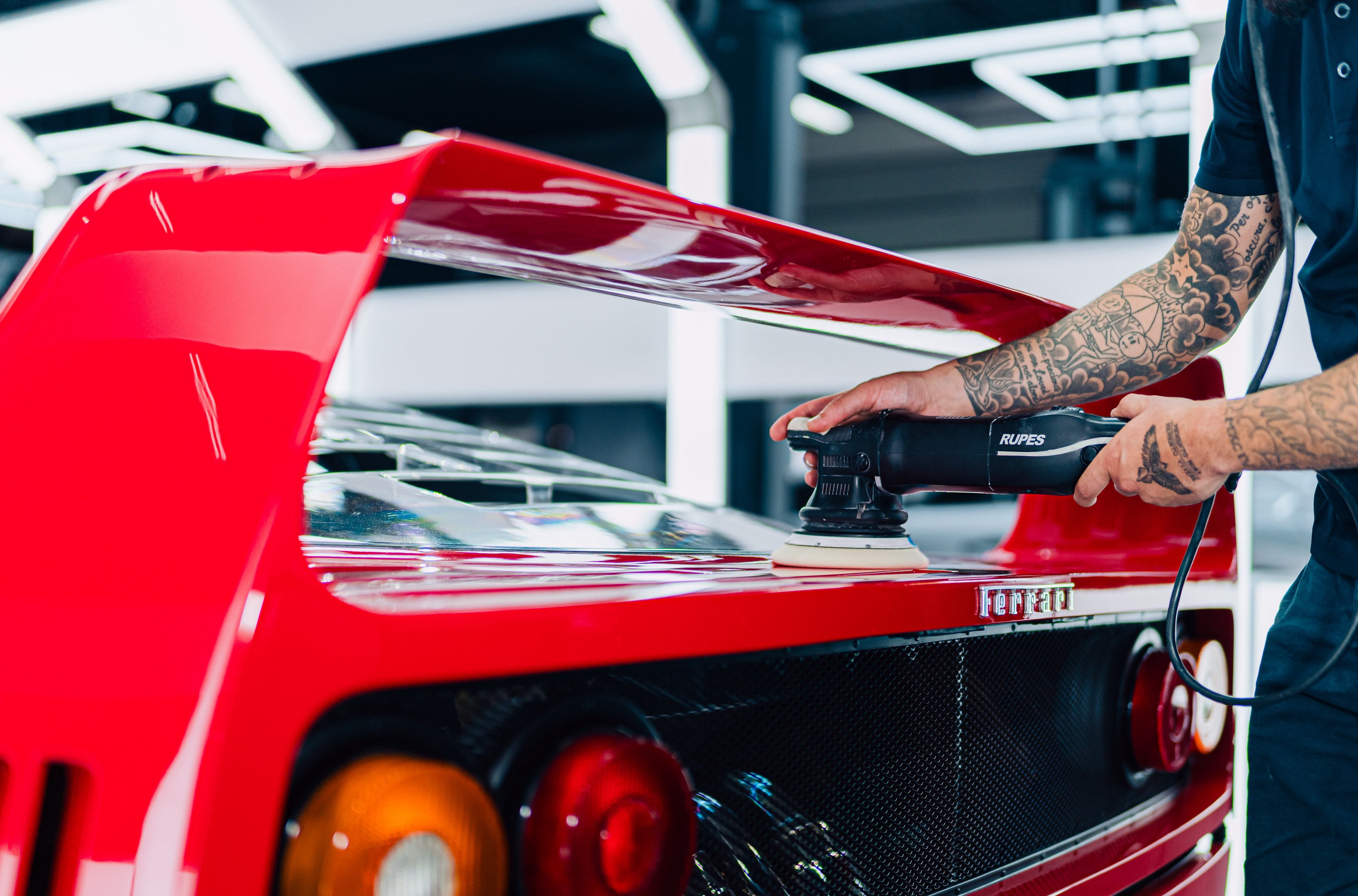 We zijn begonnen met een grondige inspectie van de composietpanelen. De originele Rosso Corsa lak is meerstaps gecorrigeerd met volledige aandacht voor het materiaal en de karakteristieke structuur van een F40. Dit is geen moderne blanke laklaag die je onbeperkt kunt corrigeren. Hier werk je met respect voor de historie van de auto. Swirls en jarenlange wasresten zijn verwijderd, zonder de authenticiteit van de lak aan te tasten.