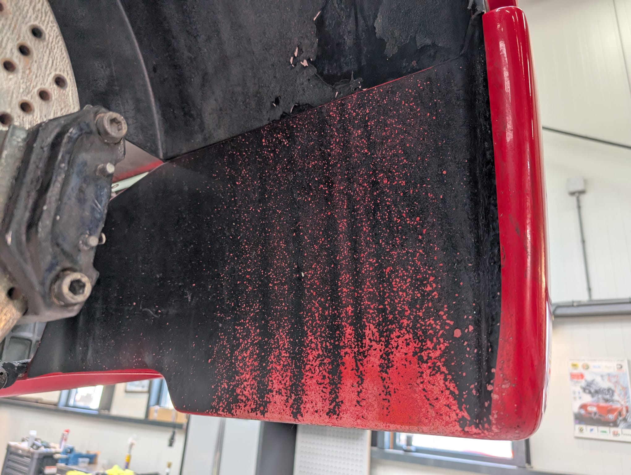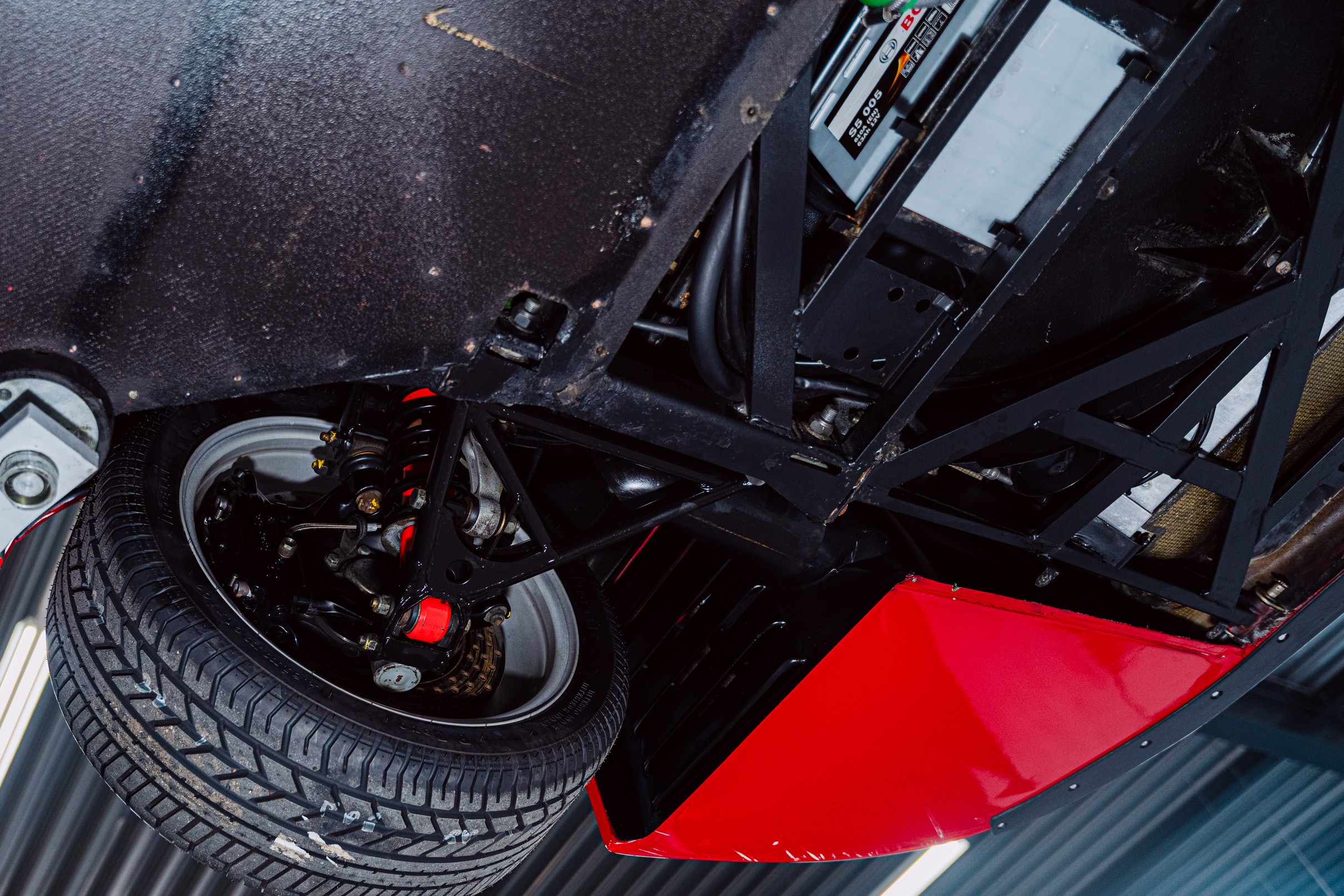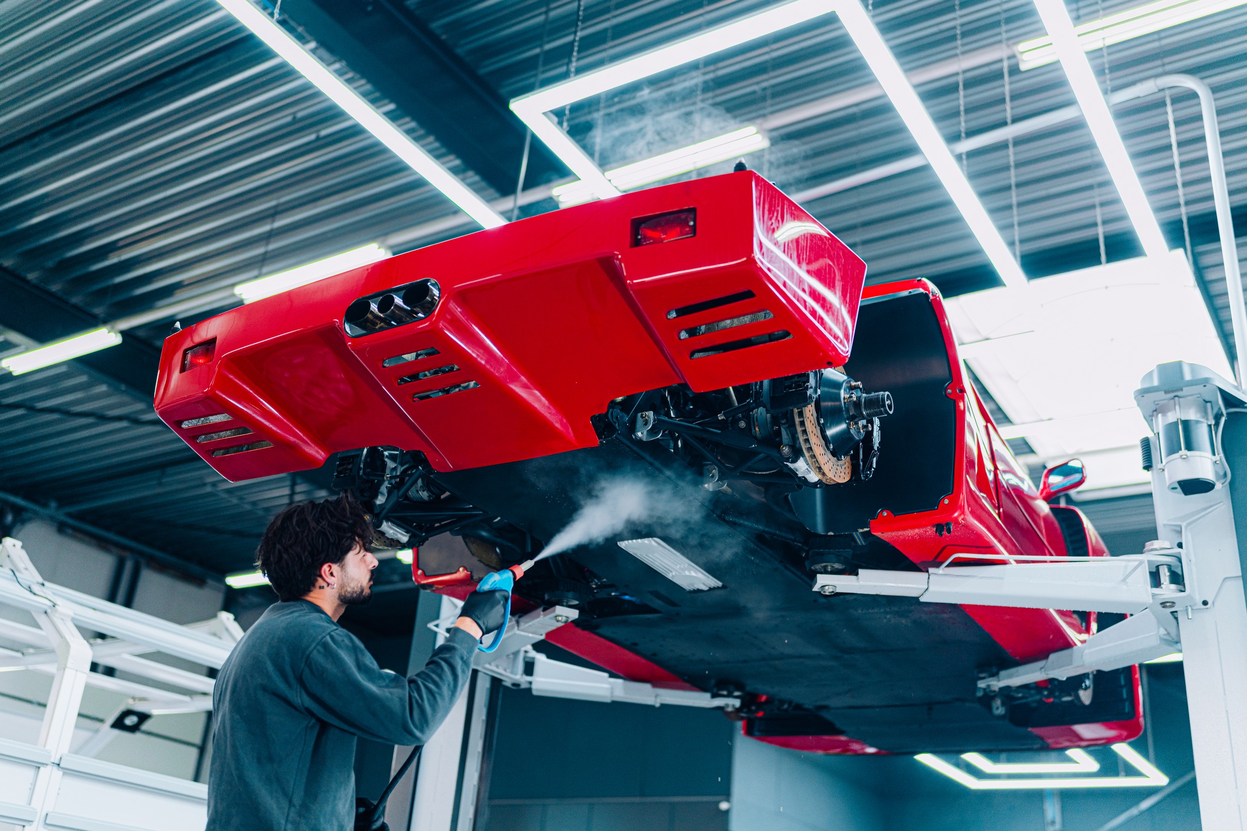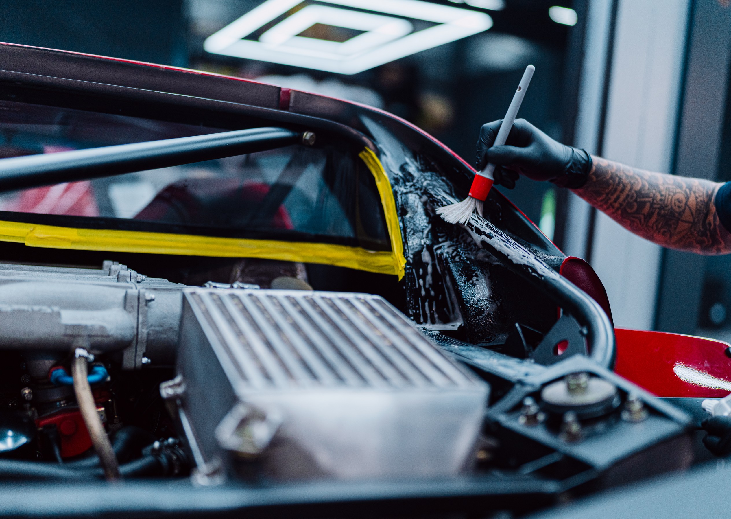 We zijn begonnen met een grondige inspectie van de composietpanelen. De originele Rosso Corsa lak is meerstaps gecorrigeerd met volledige aandacht voor het materiaal en de karakteristieke structuur van een F40. Dit is geen moderne blanke laklaag die je onbeperkt kunt corrigeren. Hier werk je met respect voor de historie van de auto. Swirls en jarenlange wasresten zijn verwijderd, zonder de authenticiteit van de lak aan te tasten.