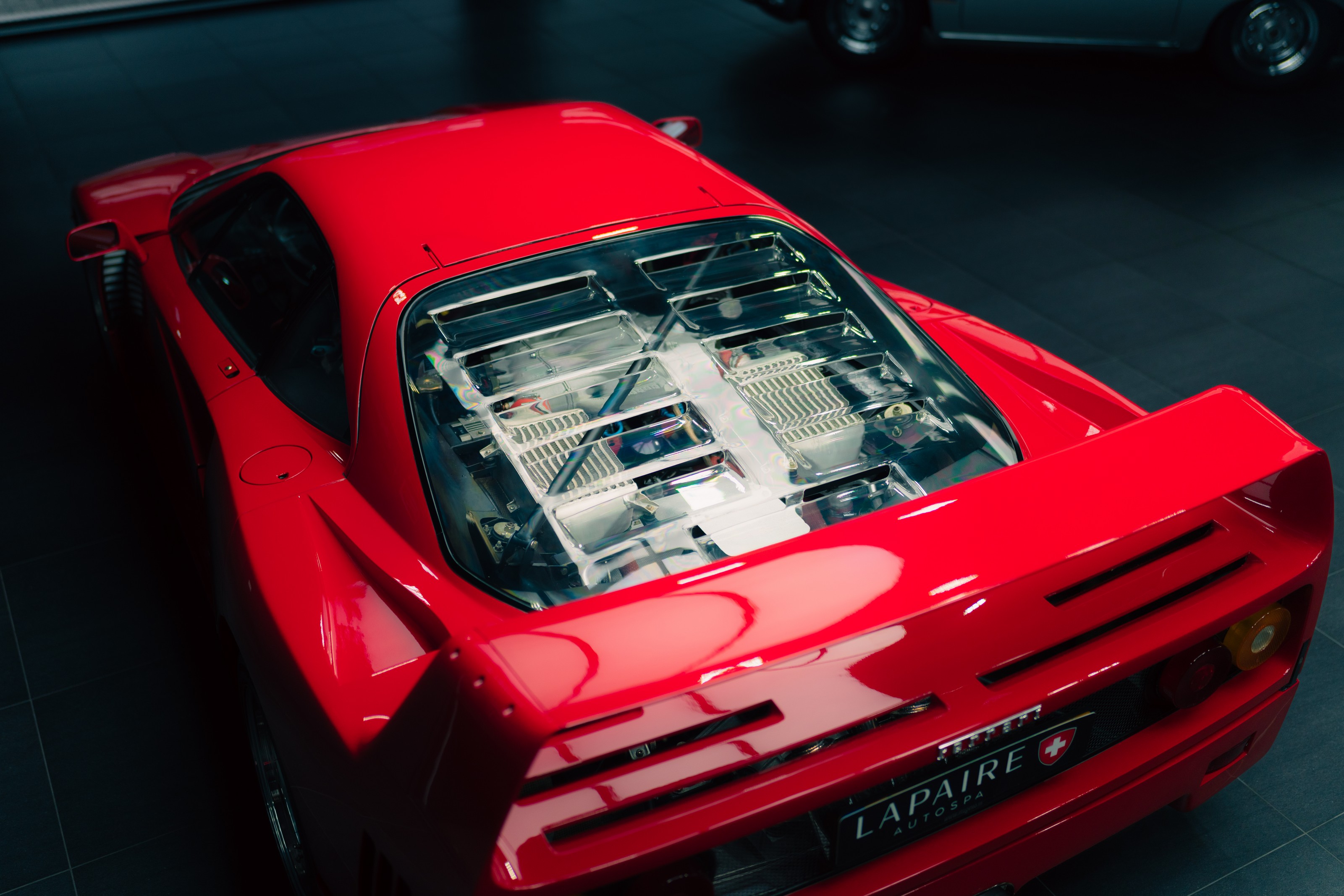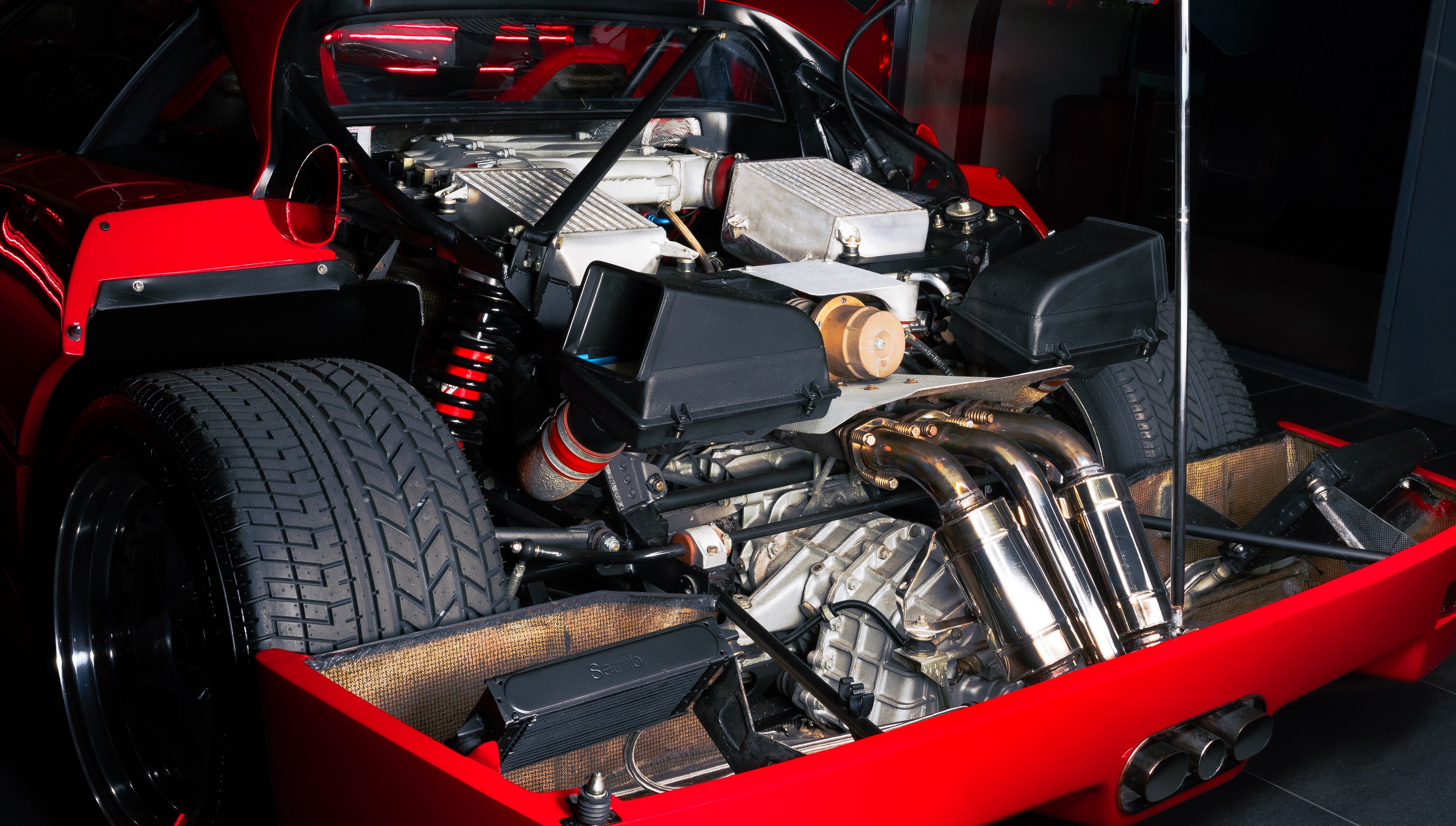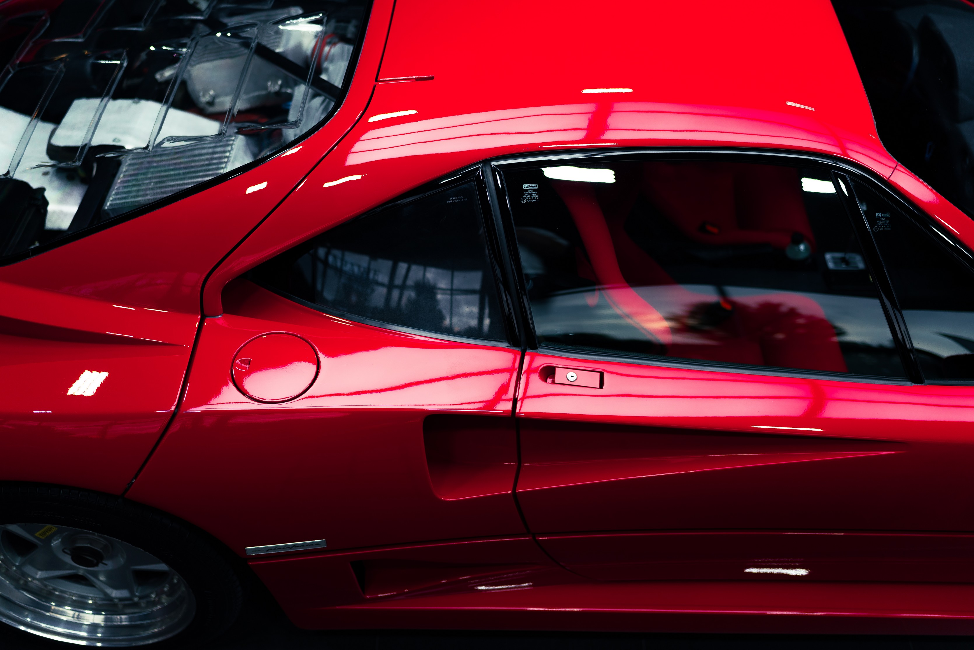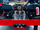 Het lexaan motorraam is zorgvuldig hersteld, zodat de motorruimte weer zichtbaar is zoals Ferrari het ooit bedoeld heeft. De twin turbo V8 mag gezien worden. Beschadigingen in de wielkasten zijn hersteld en het kevlar is lokaal gerepareerd, met behoud van de originele opbouw en uitstraling.