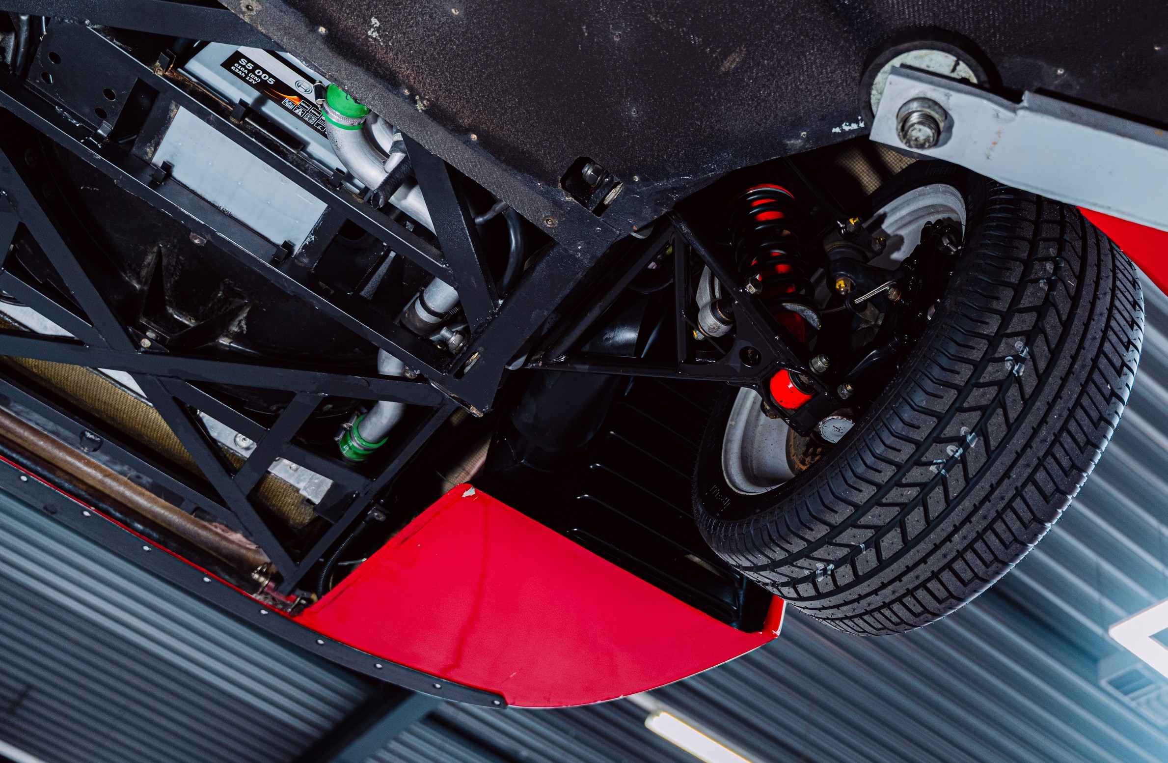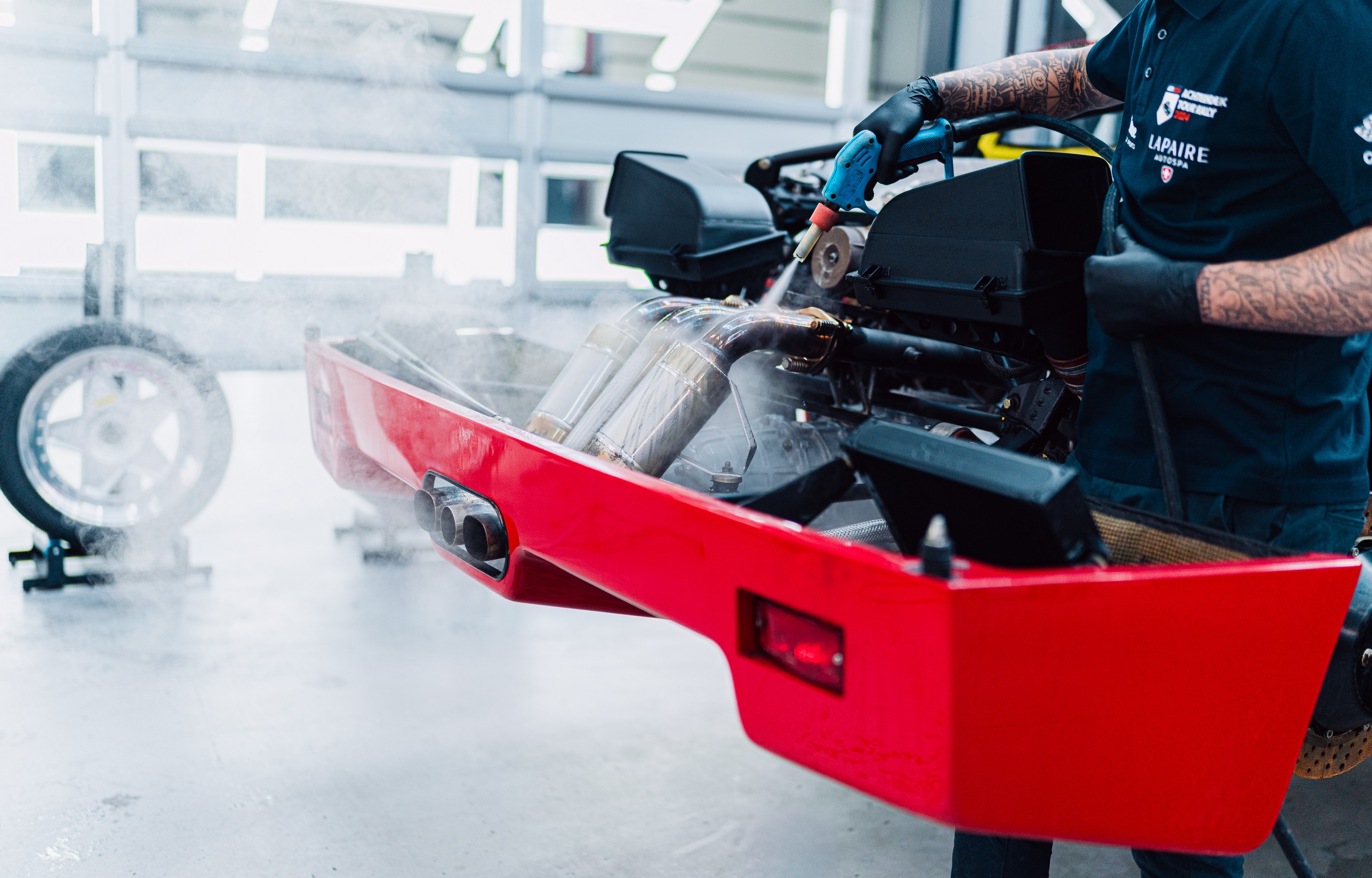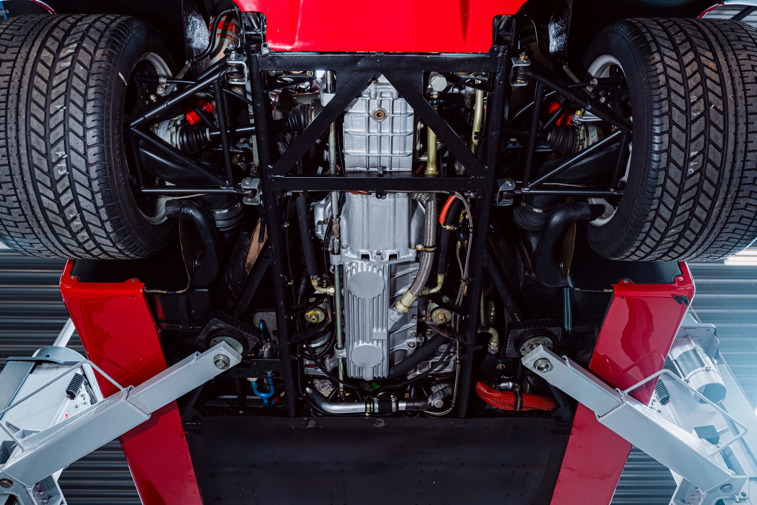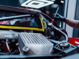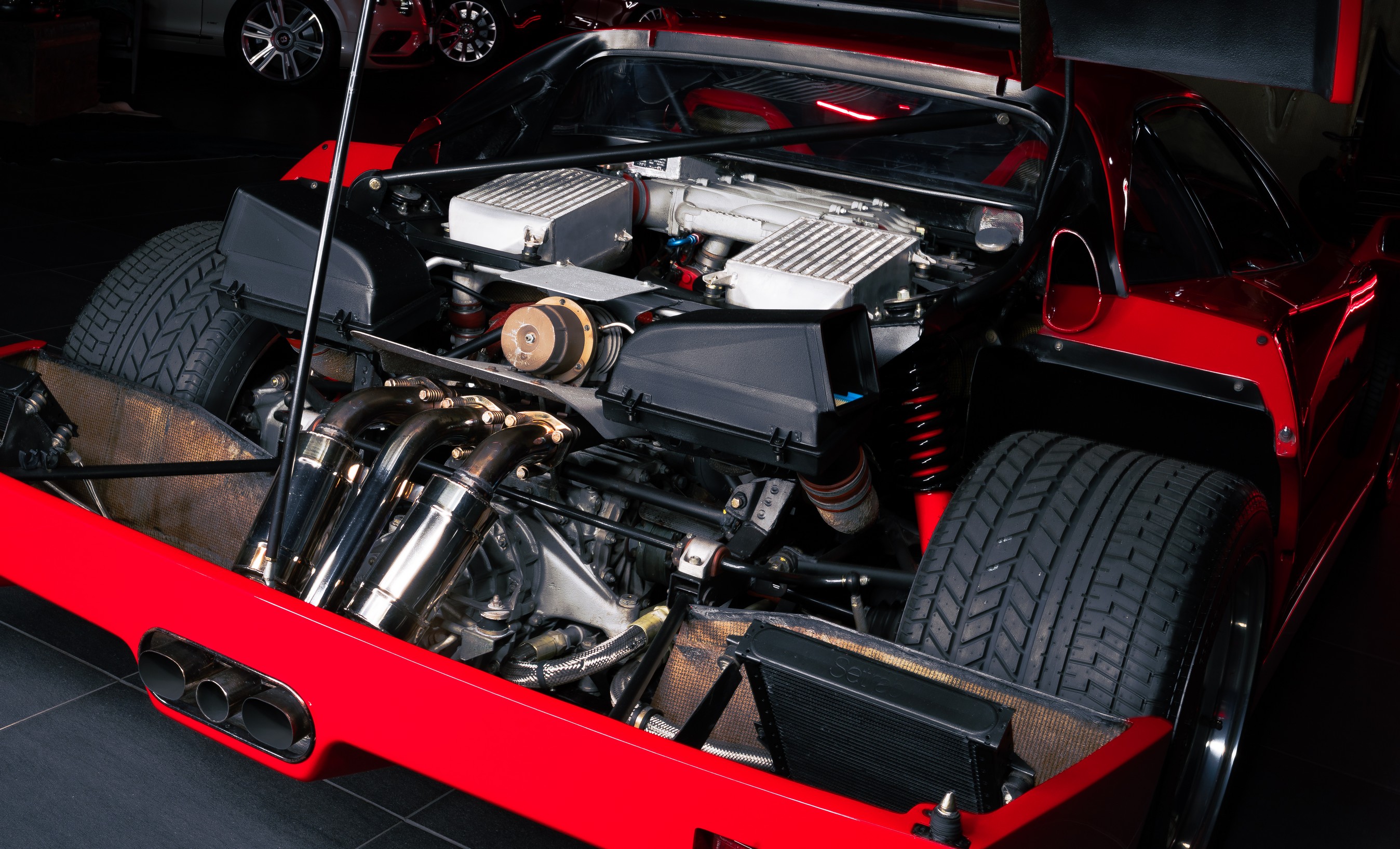 Het lexaan motorraam is zorgvuldig hersteld, zodat de motorruimte weer zichtbaar is zoals Ferrari het ooit bedoeld heeft. De twin turbo V8 mag gezien worden. Beschadigingen in de wielkasten zijn hersteld en het kevlar is lokaal gerepareerd, met behoud van de originele opbouw en uitstraling.